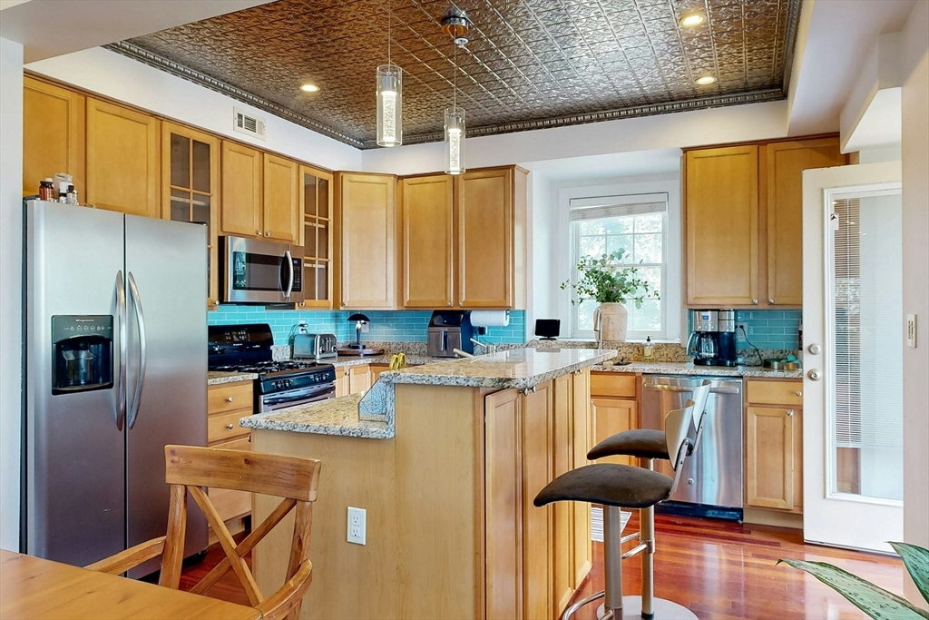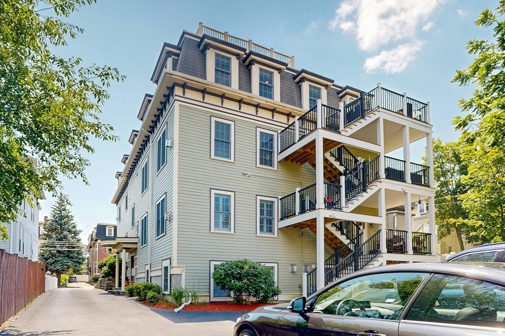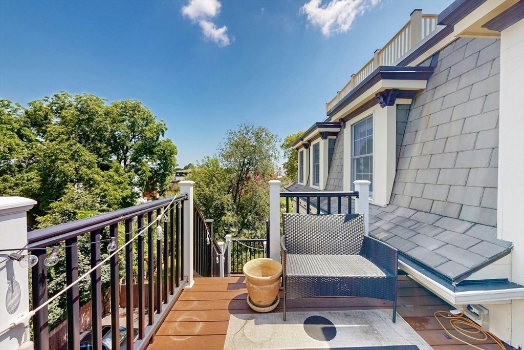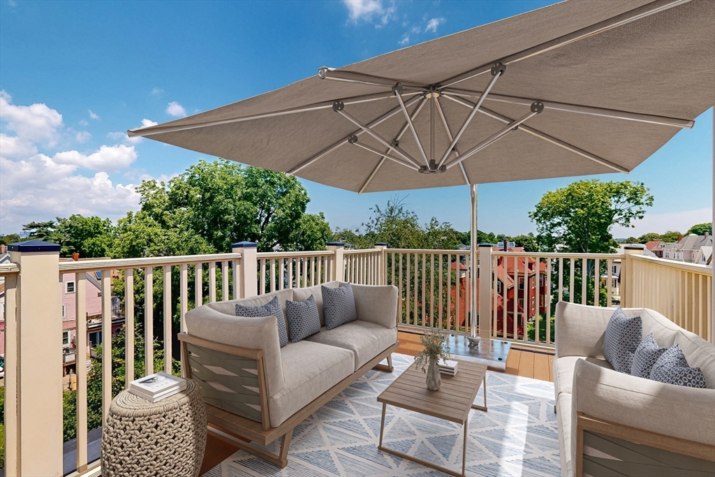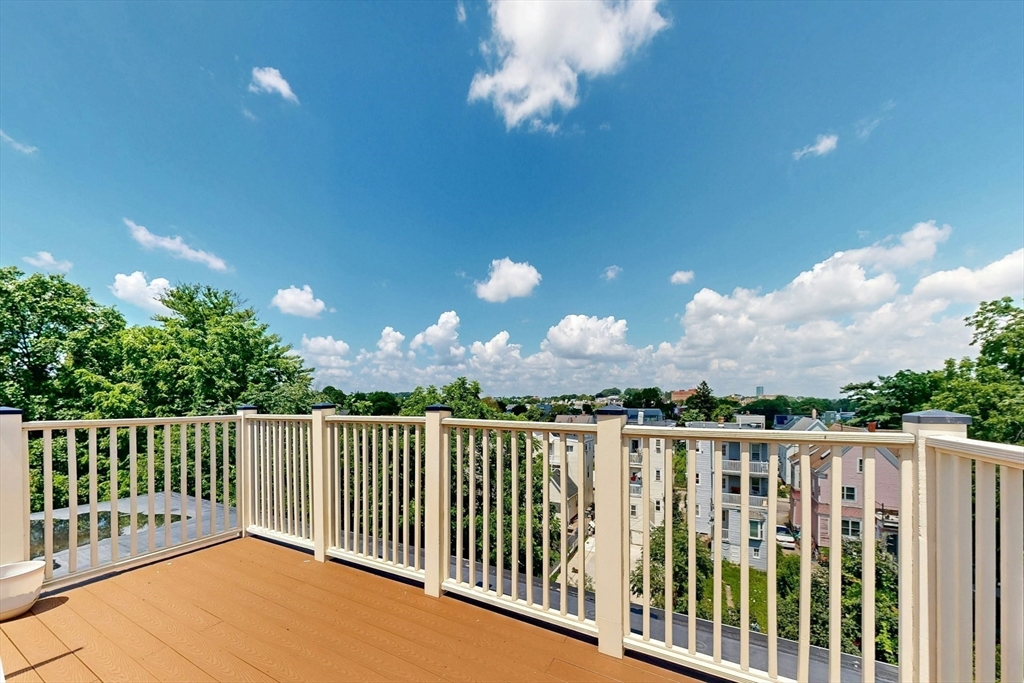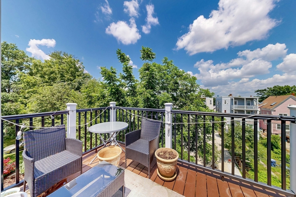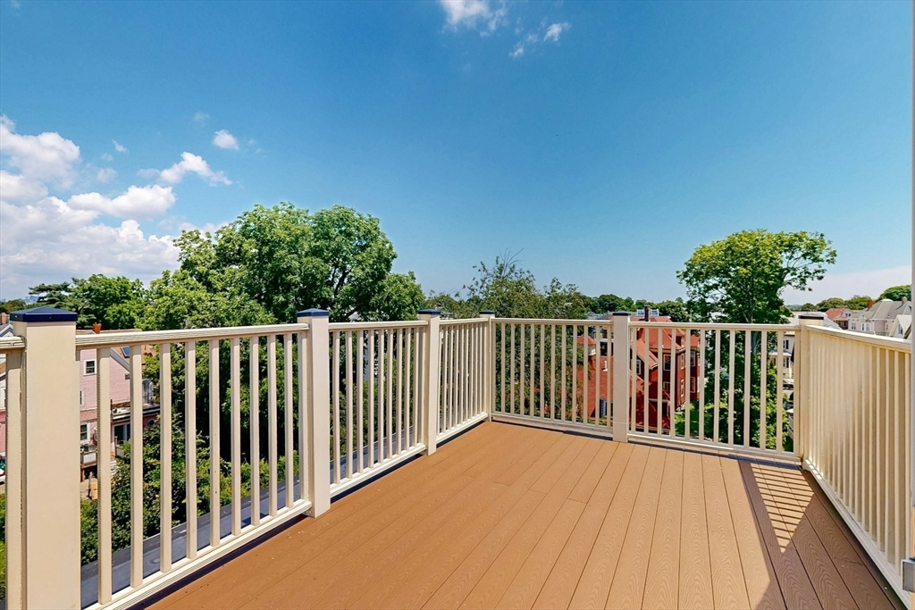 Tucked away on a charming tree-lined street, this sunny top-floor Dorchester condo blends comfort, style, and convenience. The spacious primary bedroom features a tiled en suite bath, while the second bedroom offers generous closet space. Enjoy central air, an open floor plan, and a kitchen with granite counters, a breakfast bar, wine cooler, and plenty of prep space. Choose from two private outdoor spaces - the new back deck off the kitchen or head up to your expansive roof deck with sweeping neighborhood views. Additional perks include a deeded parking spot, professional landscaping, and a large private storage unit in the lower level. All this just minutes from downtown Boston, public transit, I-93, the Harborwalk, and Seaport's restaurant scene.