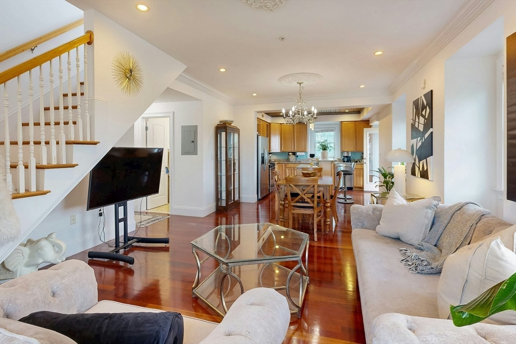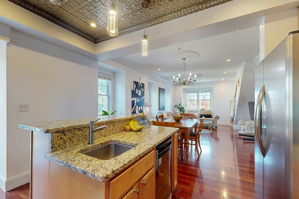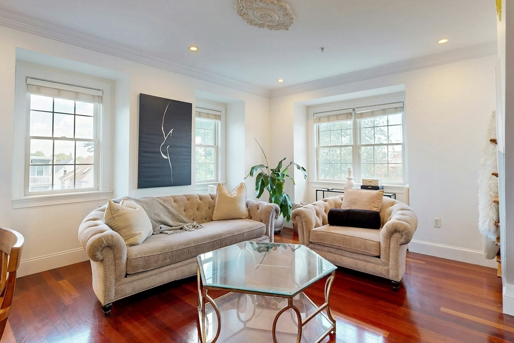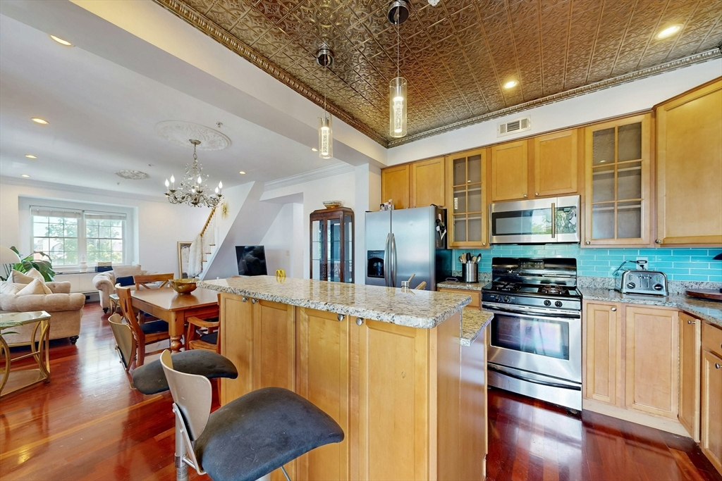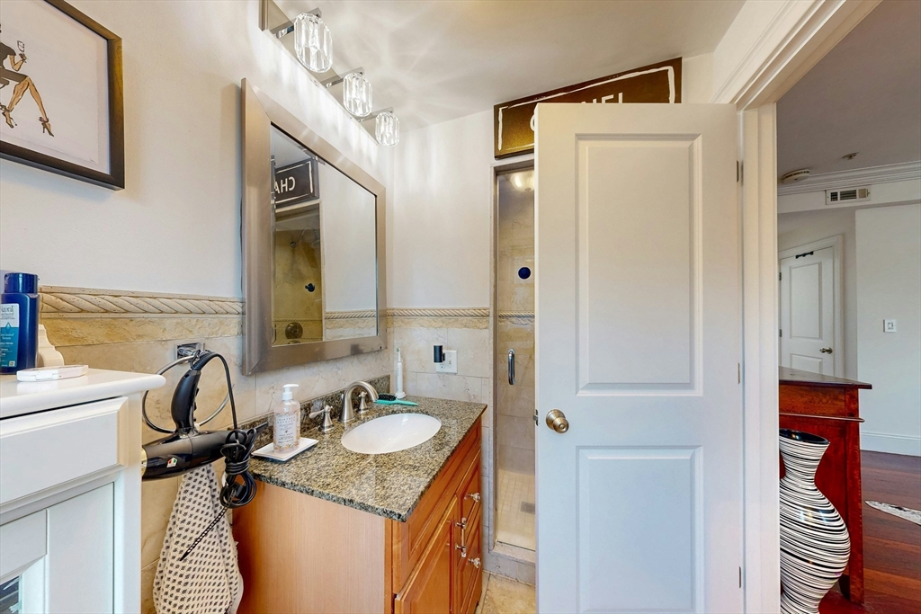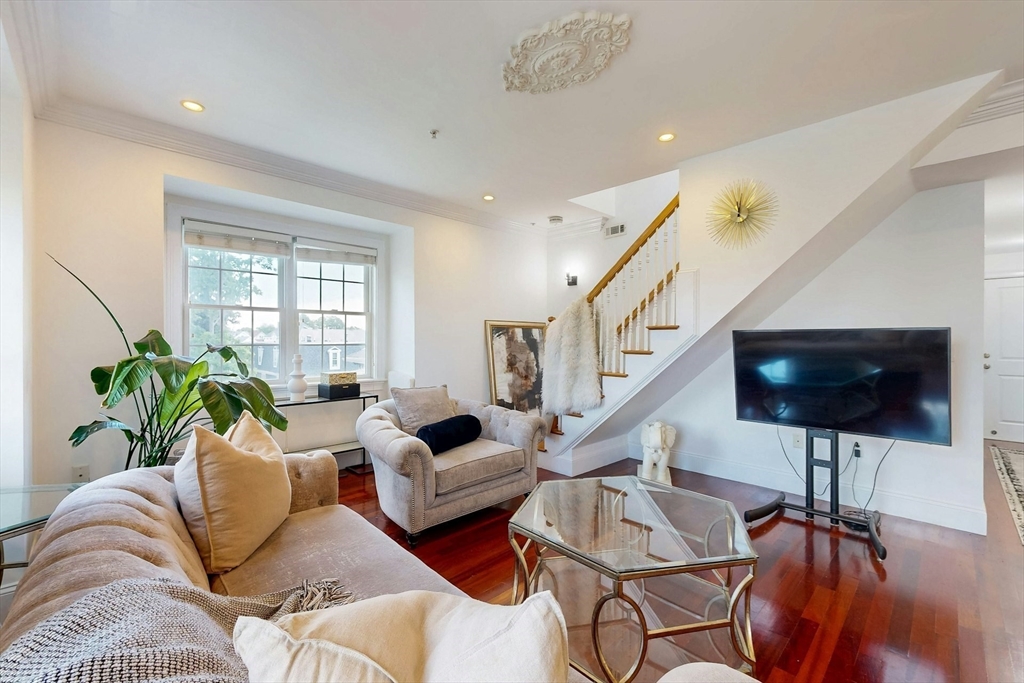 Tucked away on a charming tree-lined street, this sunny top-floor Dorchester condo blends comfort, style, and convenience. The spacious primary bedroom features a tiled en suite bath, while the second bedroom offers generous closet space. Enjoy central air, an open floor plan, and a kitchen with granite counters, a breakfast bar, wine cooler, and plenty of prep space. Choose from two private outdoor spaces - the new back deck off the kitchen or head up to your expansive roof deck with sweeping neighborhood views. Additional perks include a deeded parking spot, professional landscaping, and a large private storage unit in the lower level. All this just minutes from downtown Boston, public transit, I-93, the Harborwalk, and Seaport's restaurant scene.